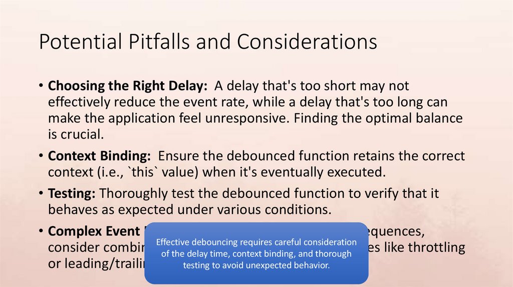 • Context Binding: Ensure the debounced function retains the correct