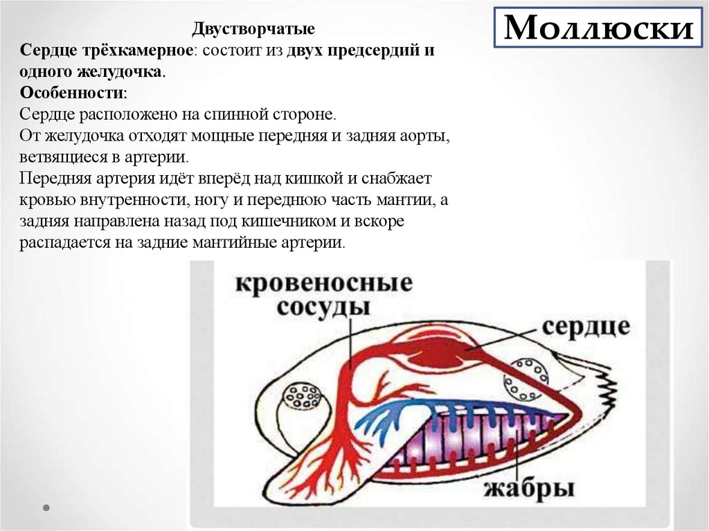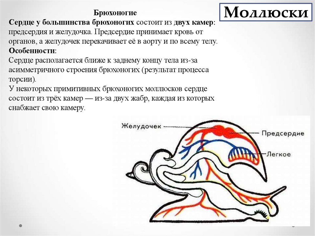 БрюхоногиеСердце у большинства брюхоногих состоит из двух камер: