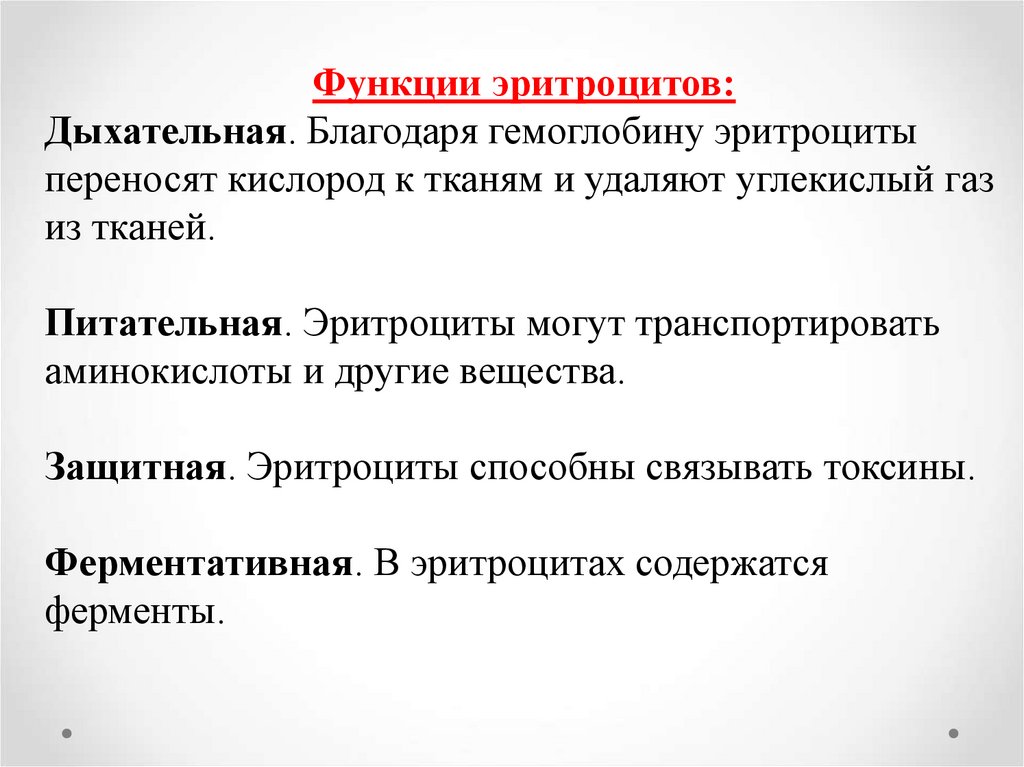 Функции эритроцитов:Дыхательная. Благодаря гемоглобину эритроциты