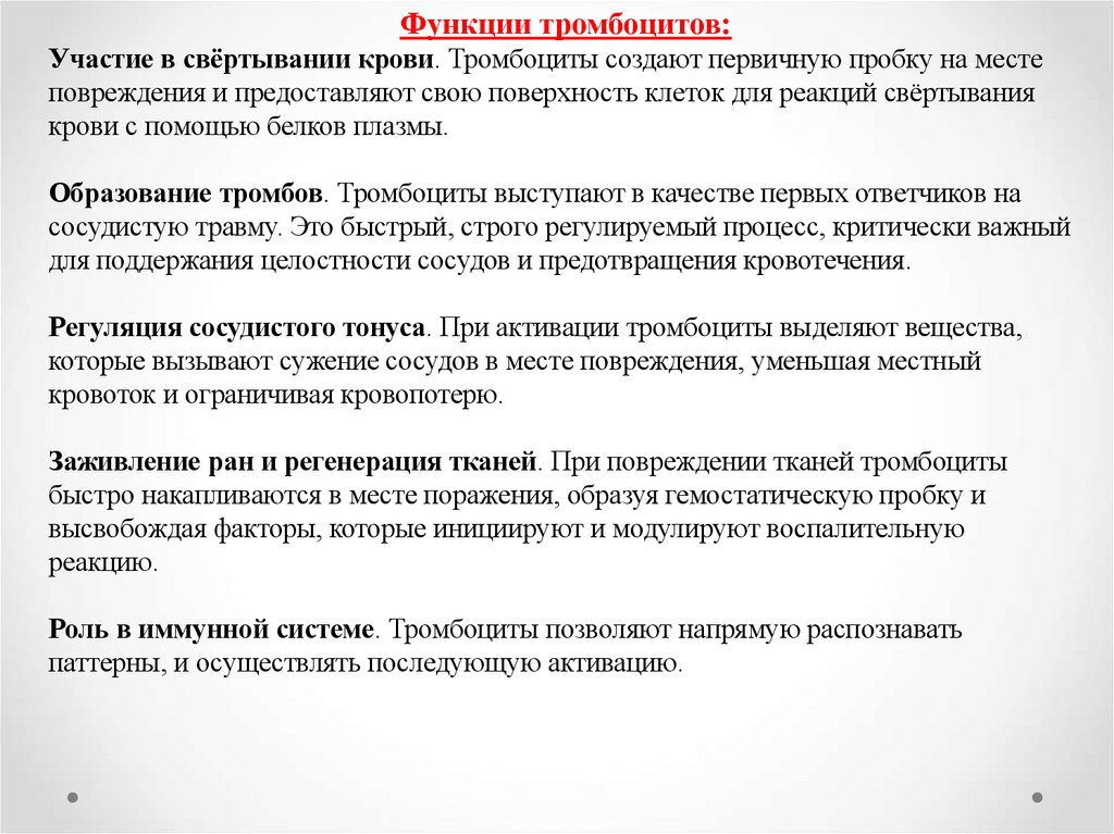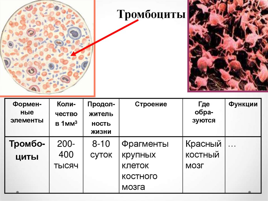 Функции тромбоцитов:Участие в свёртывании крови. Тромбоциты создают первичную пробку на месте