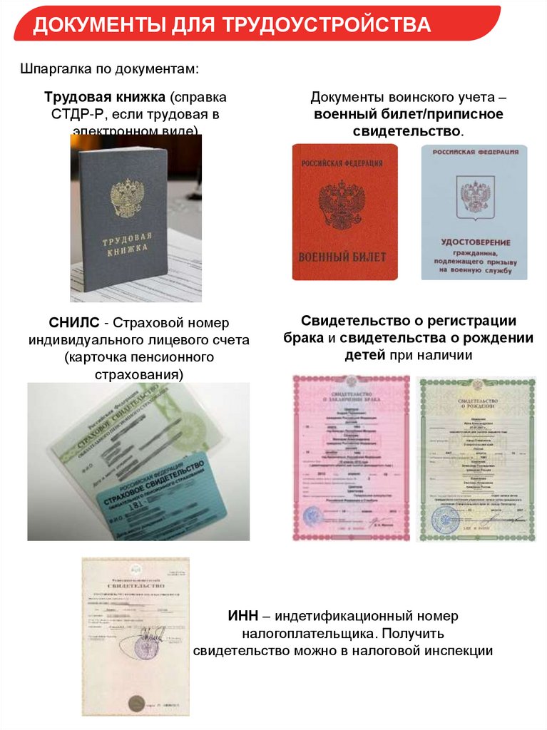 ДОКУМЕНТЫ ДЛЯ ТРУДОУСТРОЙСТВАШпаргалка по документам: