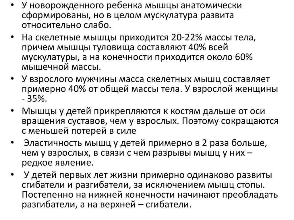 • У детей, в отличие от взрослых, отношение массы мышц кмассе тела меньше. Считается, что у новорожденного
