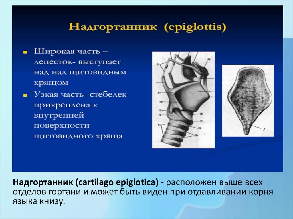 Надгортанник (cartilago epiglotica) - расположен выше всехотделов гортани и может быть виден при отдавливании корня