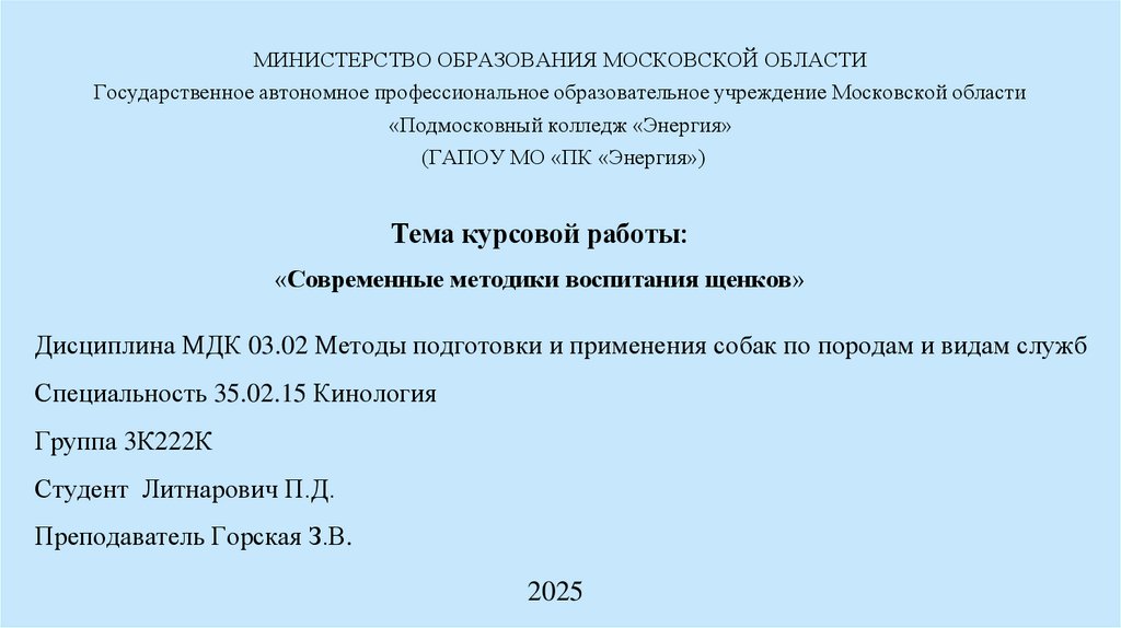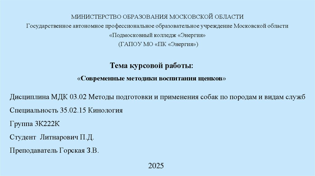 Дисциплина МДК 03.02 Методы подготовки и применения собак по породам и видам служб