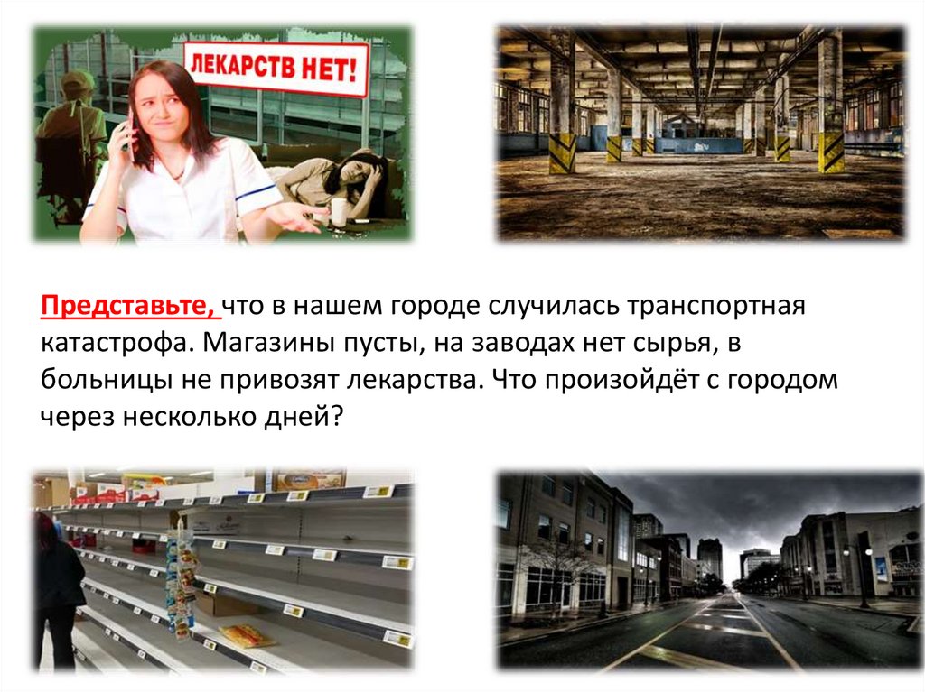 Представьте, что в нашем городе случилась транспортнаякатастрофа. Магазины пусты, на заводах нет сырья, в