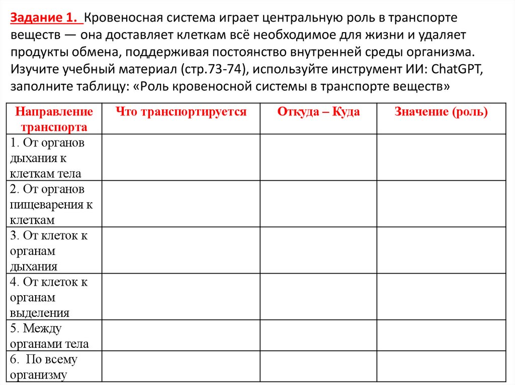 Задание 1. Кровеносная система играет центральную роль в транспортевеществ — она доставляет клеткам всё необходимое для жизни и удаляет