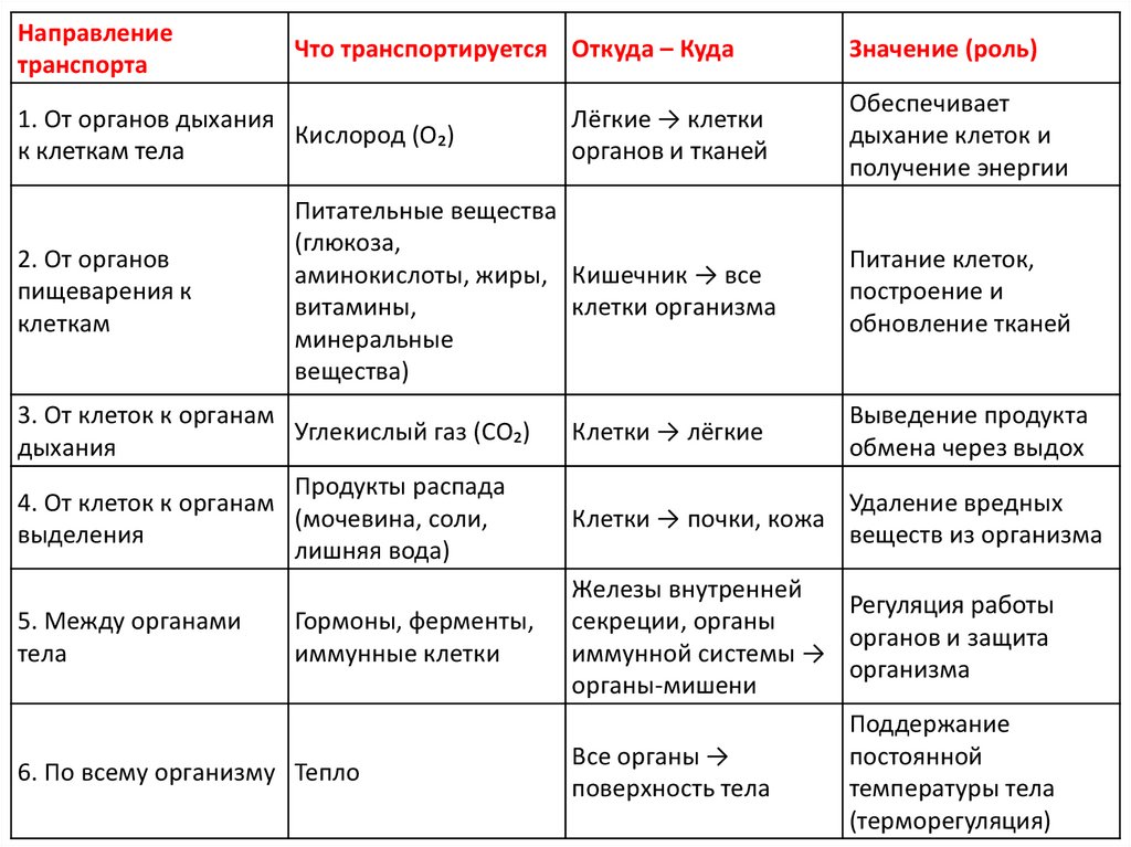 заполните таблицу: «Роль кровеносной системы в транспорте веществ»