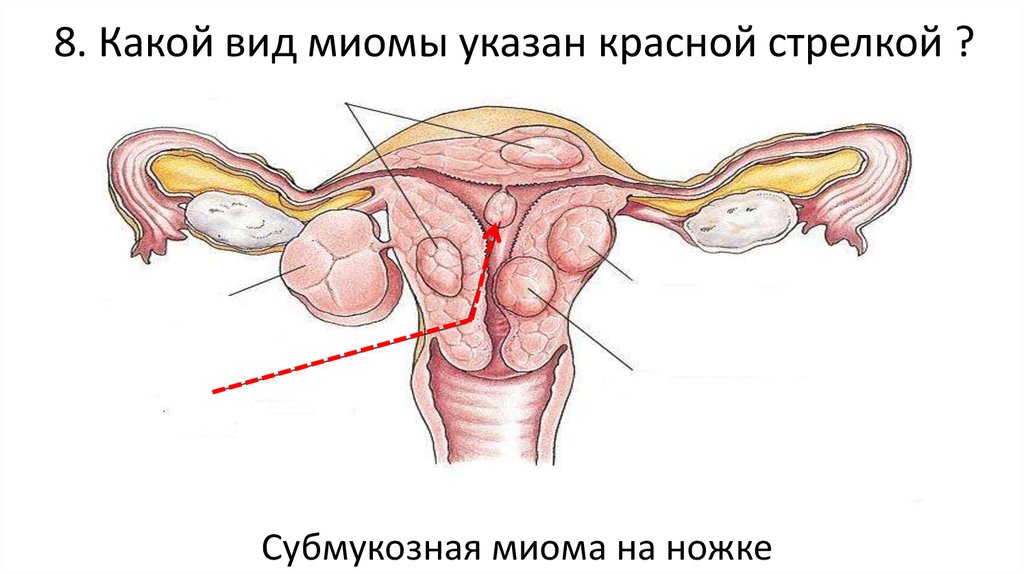 8. Какой вид миомы указан красной стрелкой ?Субмукозная миома на ножке