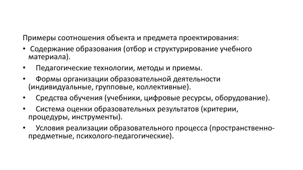 Примеры соотношения объекта и предмета проектирования:• Содержание образования (отбор и структурирование учебного