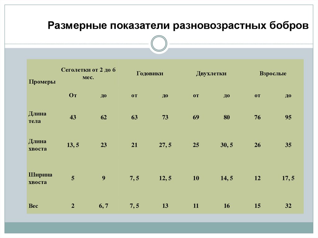 Размерные показатели разновозрастных бобровПромеры