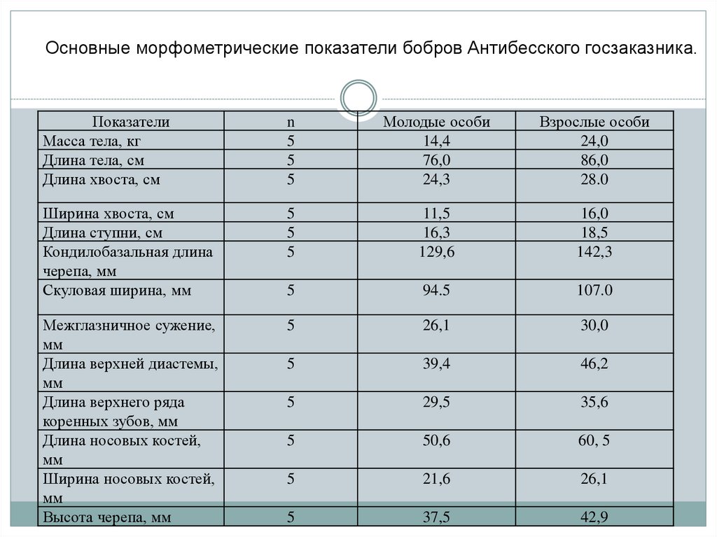 Основные морфометрические показатели бобров Антибесского госзаказника.Показатели