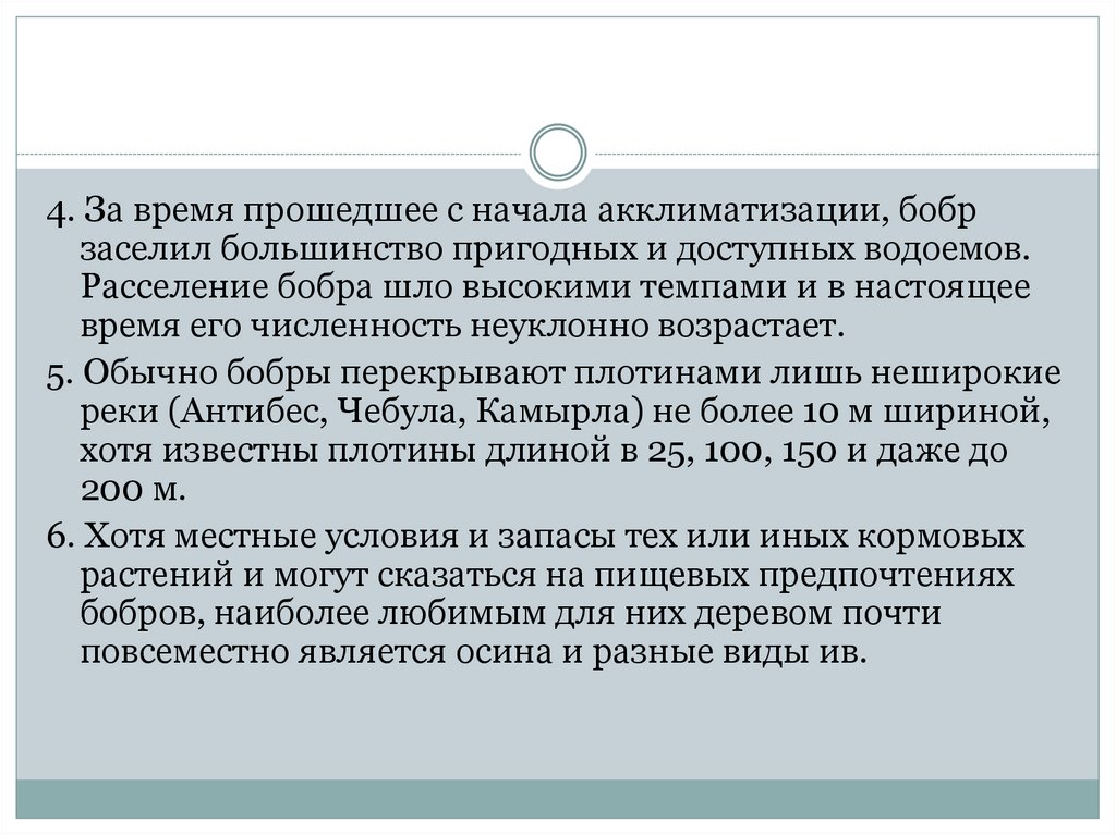 4. За время прошедшее с начала акклиматизации, бобрзаселил большинство пригодных и доступных водоемов.