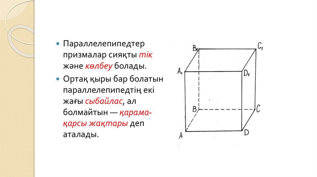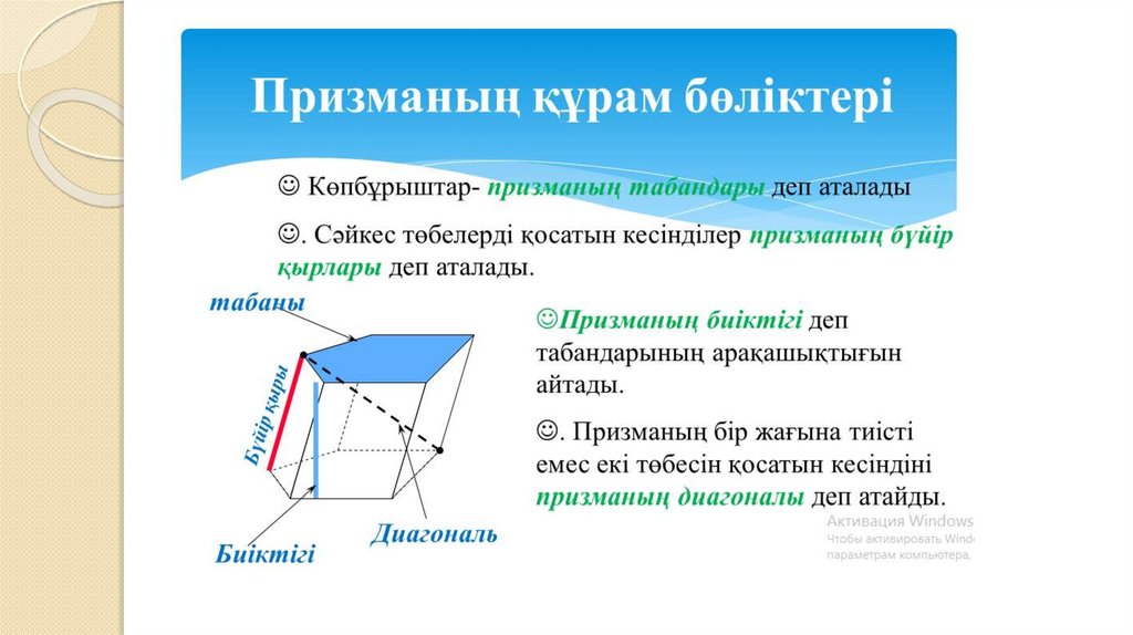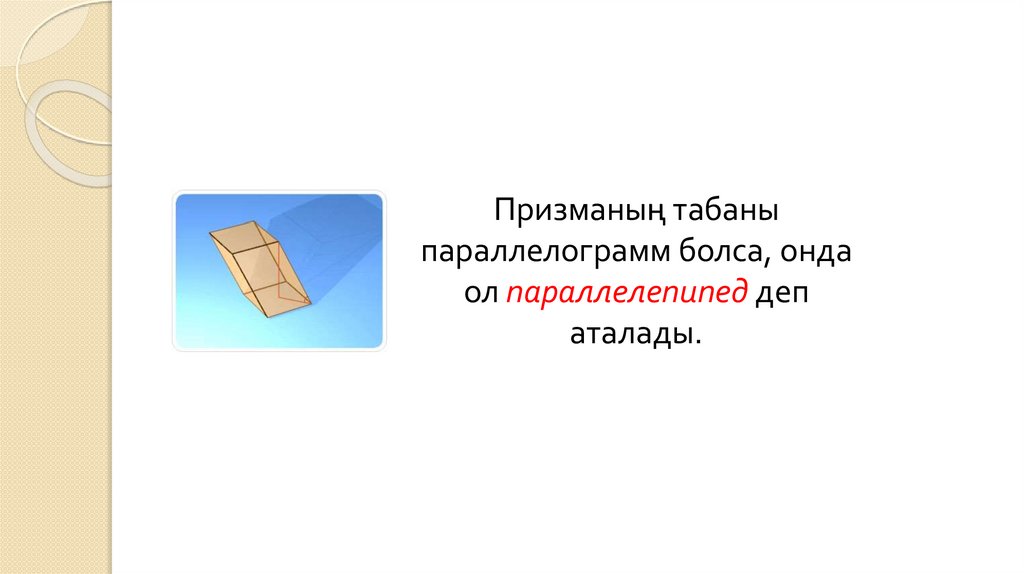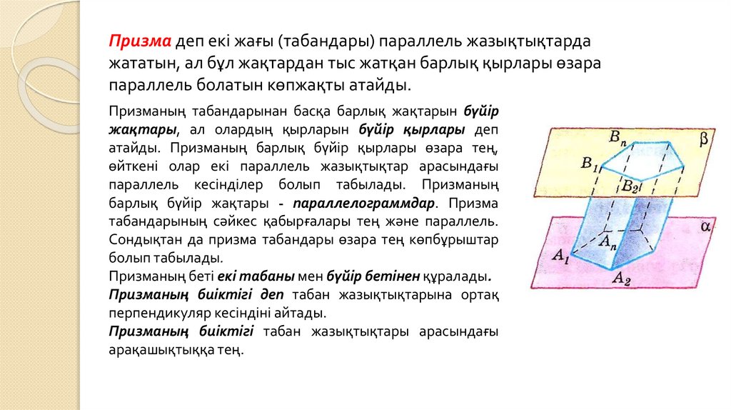 Призма деп екі жағы (табандары) параллель жазықтықтардажататын, ал бұл жақтардан тыс жатқан барлық қырлары өзара
