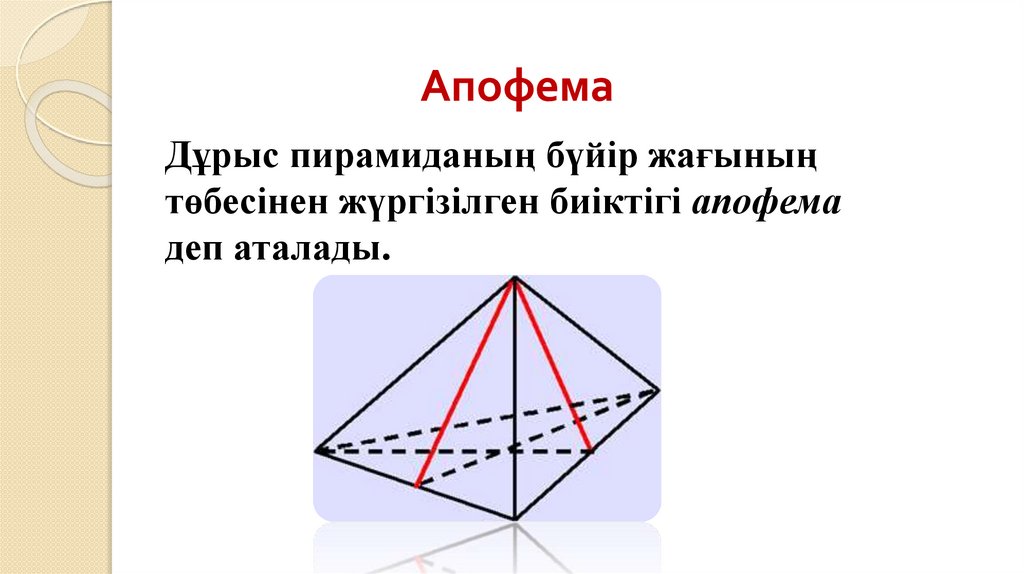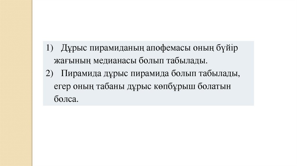 1) Дұрыс пирамиданың апофемасы оның бүйіржағының медианасы болып табылады.