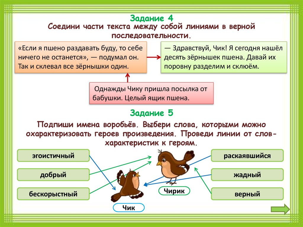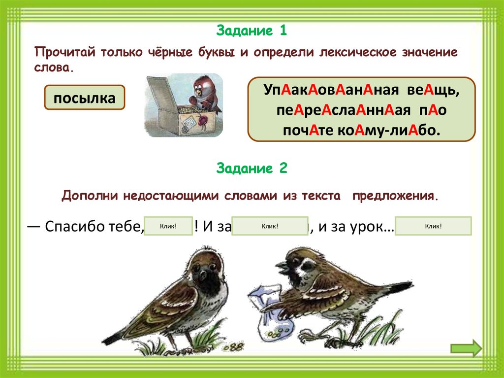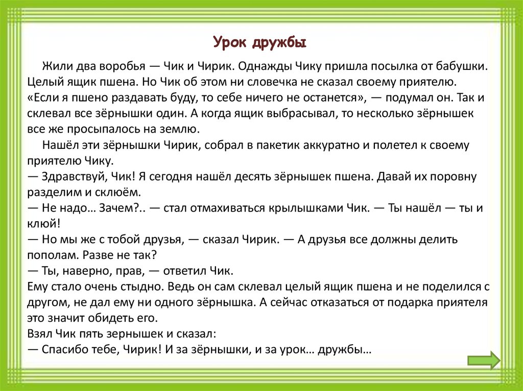 Урок дружбыЖили два воробья — Чик и Чирик. Однажды Чику пришла посылка от бабушки.