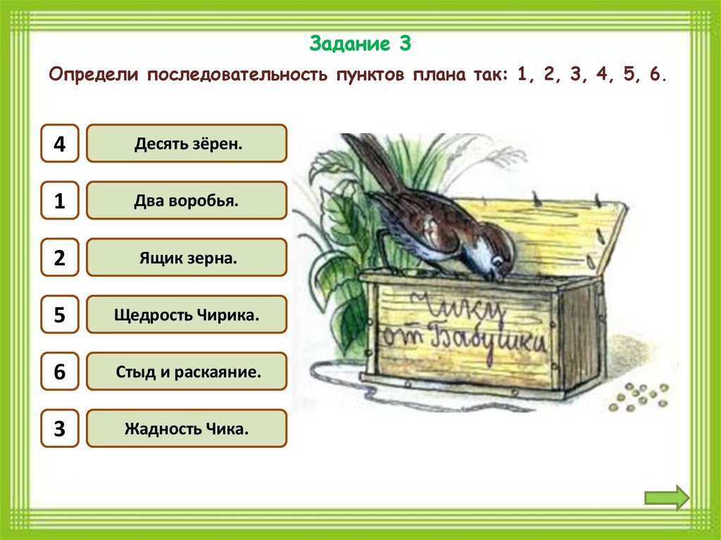 Задание 3Определи последовательность пунктов плана так: 1, 2, 3, 4, 5, 6.