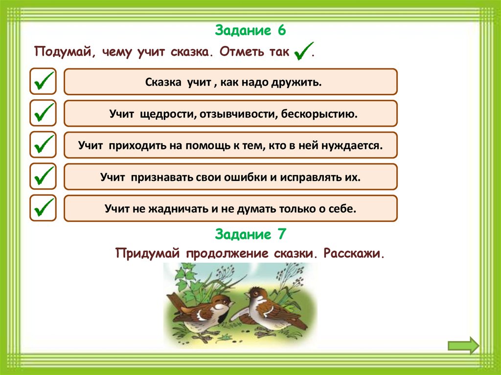 Задание 6Подумай, чему учит сказка. Отметь так