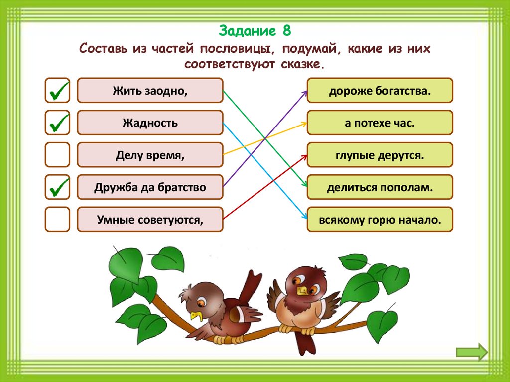 Задание 8Составь из частей пословицы, подумай, какие из них