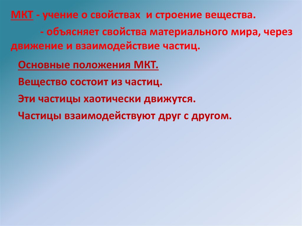 МКТ - учение о свойствах и строение вещества.- объясняет свойства материального мира, через