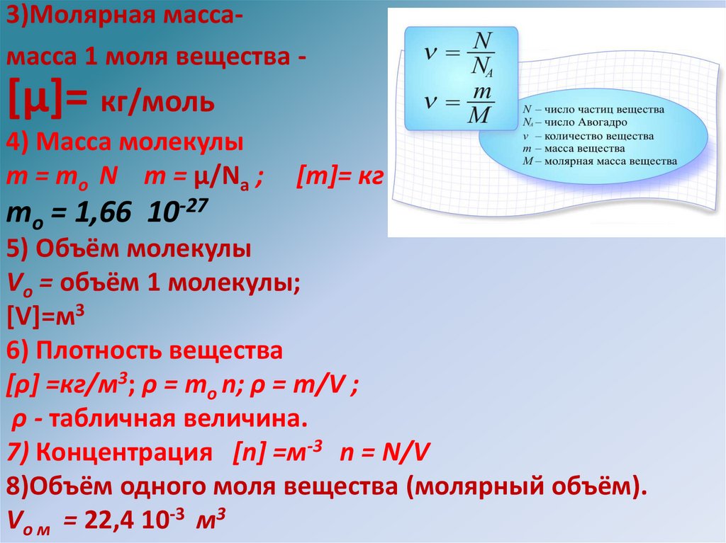 • Концентрация частиц: n=N/V, где N = νNa