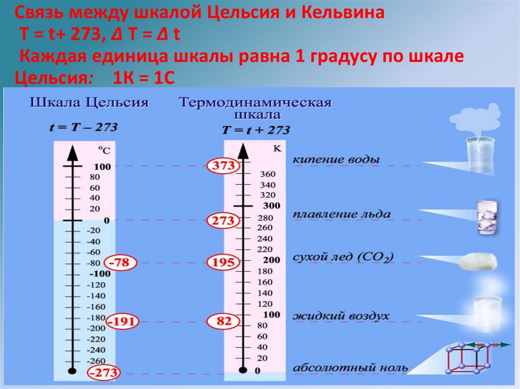 Связь между шкалой Цельсия и КельвинаТ = t+ 273, ∆ T = ∆ t