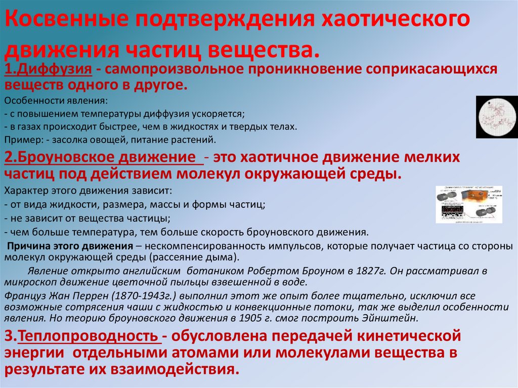Косвенные подтверждения хаотическогодвижения частиц вещества.