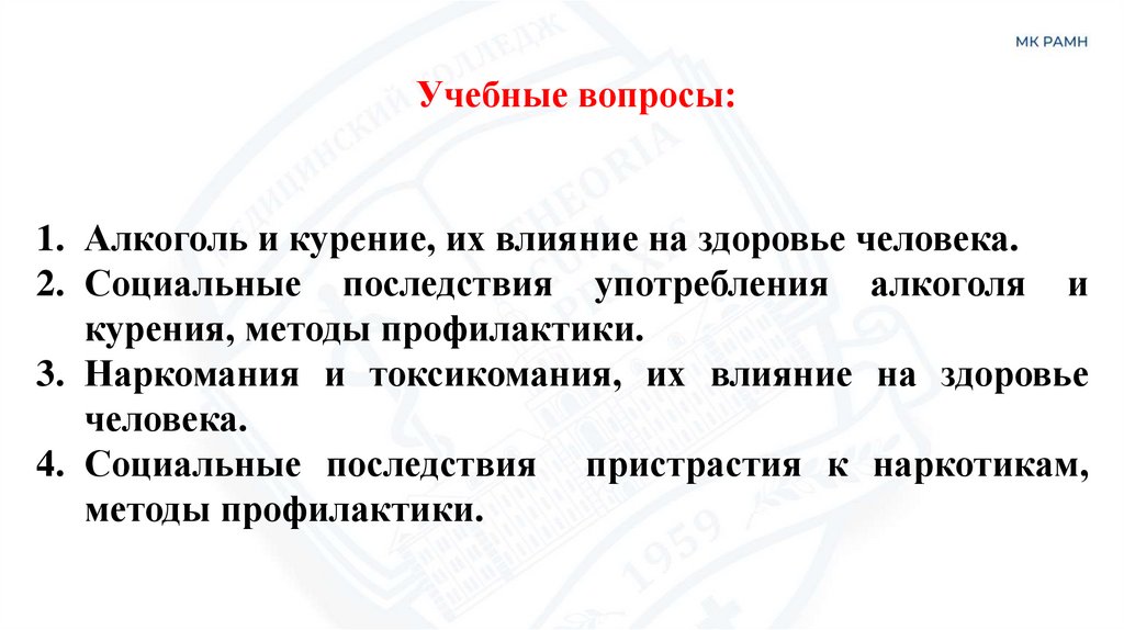Учебные вопросы:1. Алкоголь и курение, их влияние на здоровье человека.