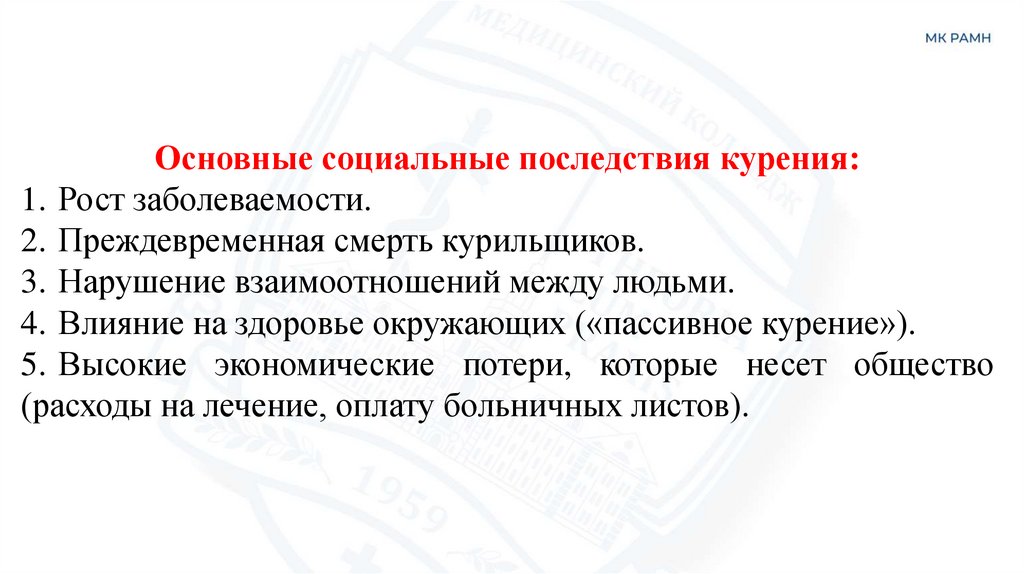 Основные социальные последствия курения:1. Рост заболеваемости.