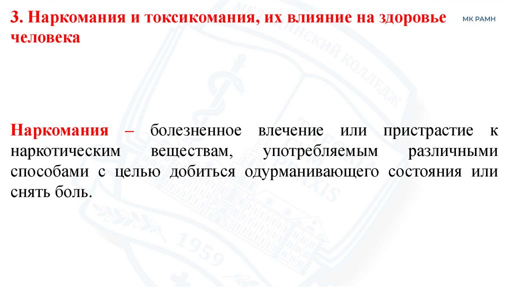3. Наркомания и токсикомания, их влияние на здоровьечеловека