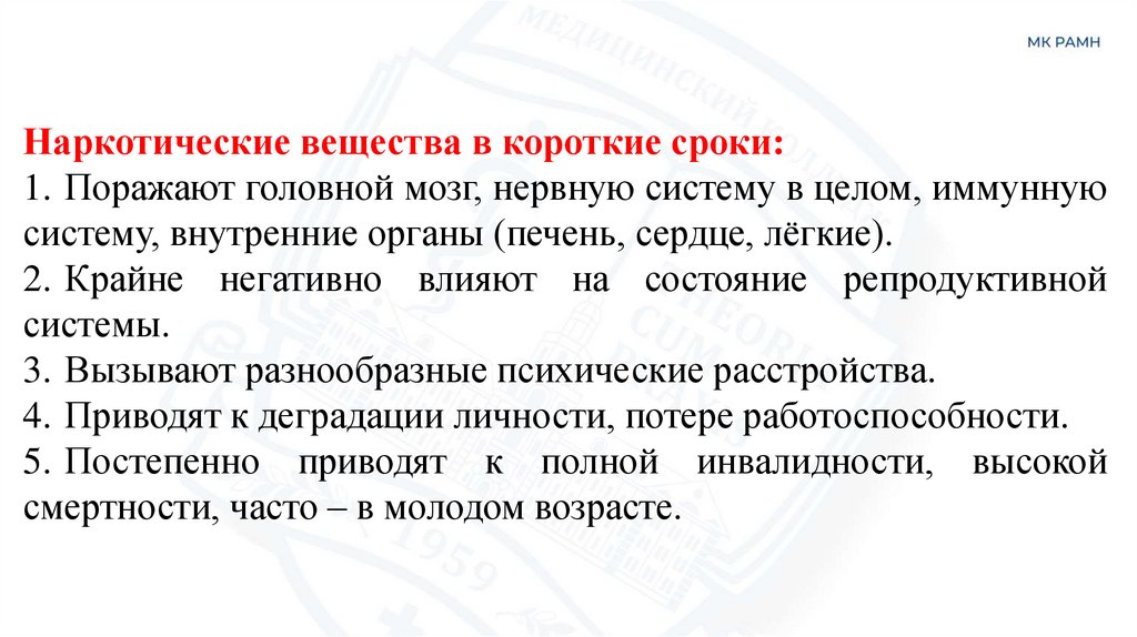 Наркотические вещества в короткие сроки:1. Поражают головной мозг, нервную систему в целом, иммунную