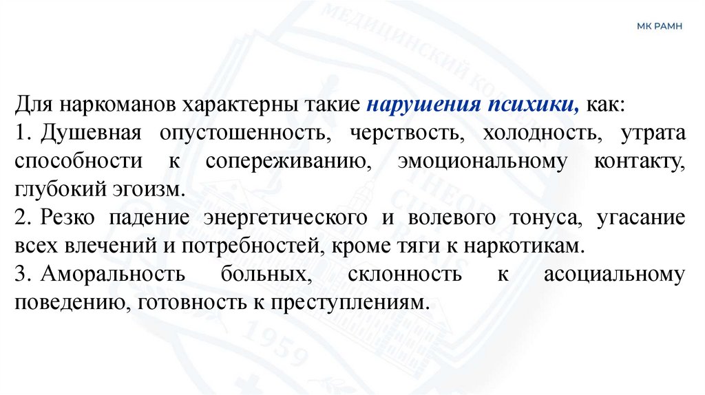 Для наркоманов характерны такие нарушения психики, как:1. Душевная опустошенность, черствость, холодность, утрата