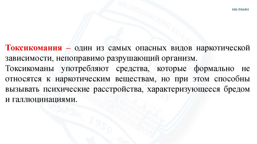 Токсикомания – один из самых опасных видов наркотическойзависимости, непоправимо разрушающий организм.