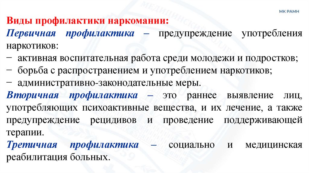 Виды профилактики наркомании:Первичная профилактика – предупреждение употребления