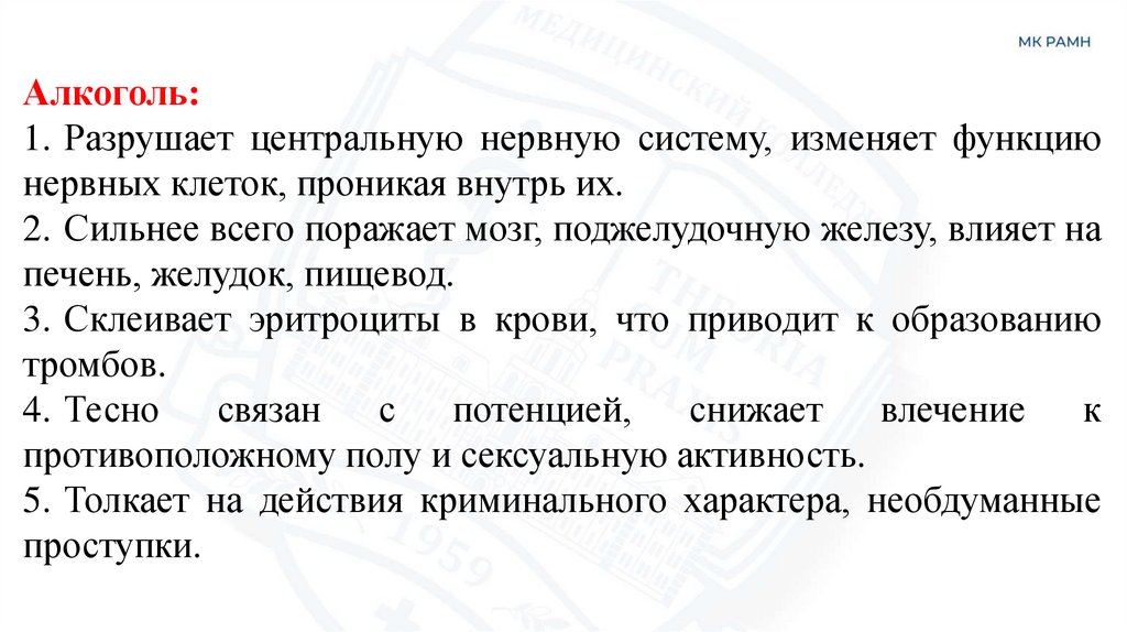 Алкоголь:1. Разрушает центральную нервную систему, изменяет функцию