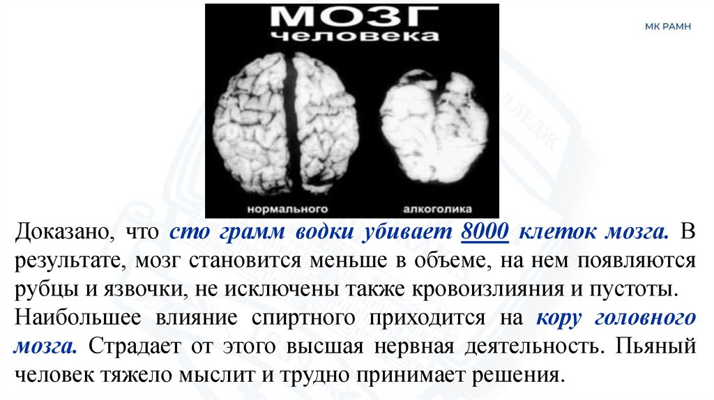 Доказано, что сто грамм водки убивает 8000 клеток мозга. Врезультате, мозг становится меньше в объеме, на нем появляются