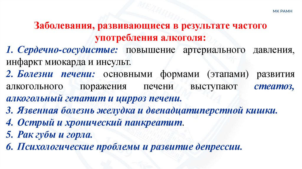 Заболевания, развивающиеся в результате частогоупотребления алкоголя:
