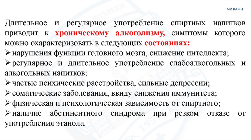 Длительное и регулярное употребление спиртных напитковприводит к хроническому алкоголизму, симптомы которого