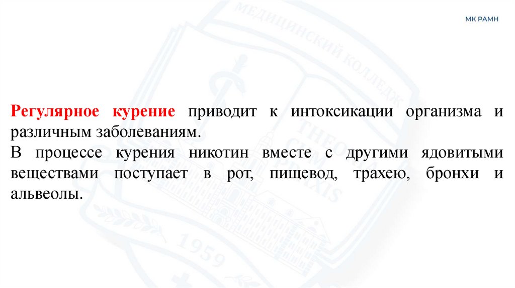 Регулярное курение приводит к интоксикации организма иразличным заболеваниям.