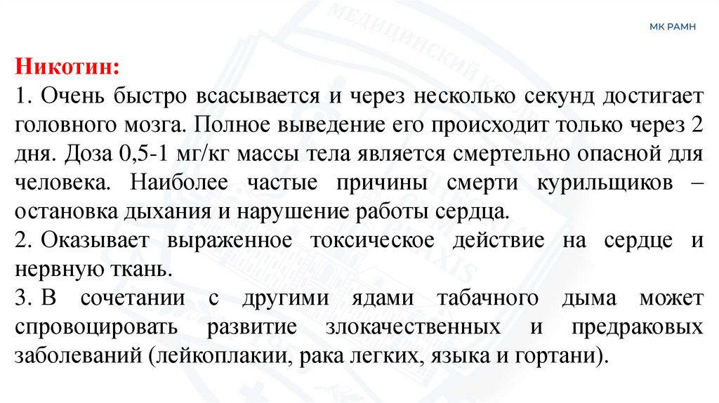 Никотин:1. Очень быстро всасывается и через несколько секунд достигает
