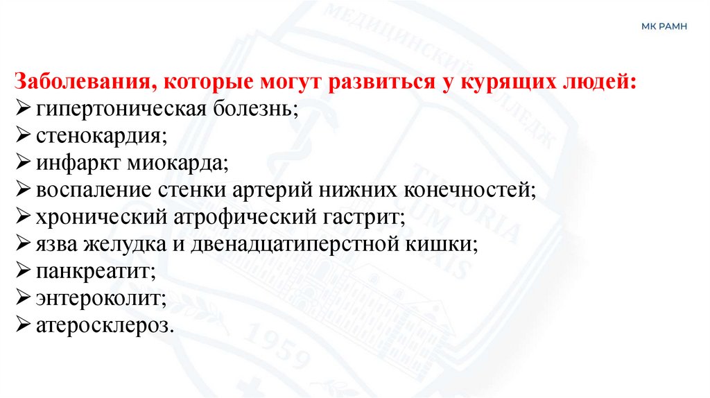заболеваний (лейкоплакии, рака легких, языка и гортани).