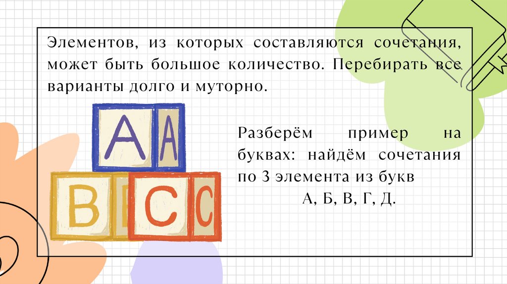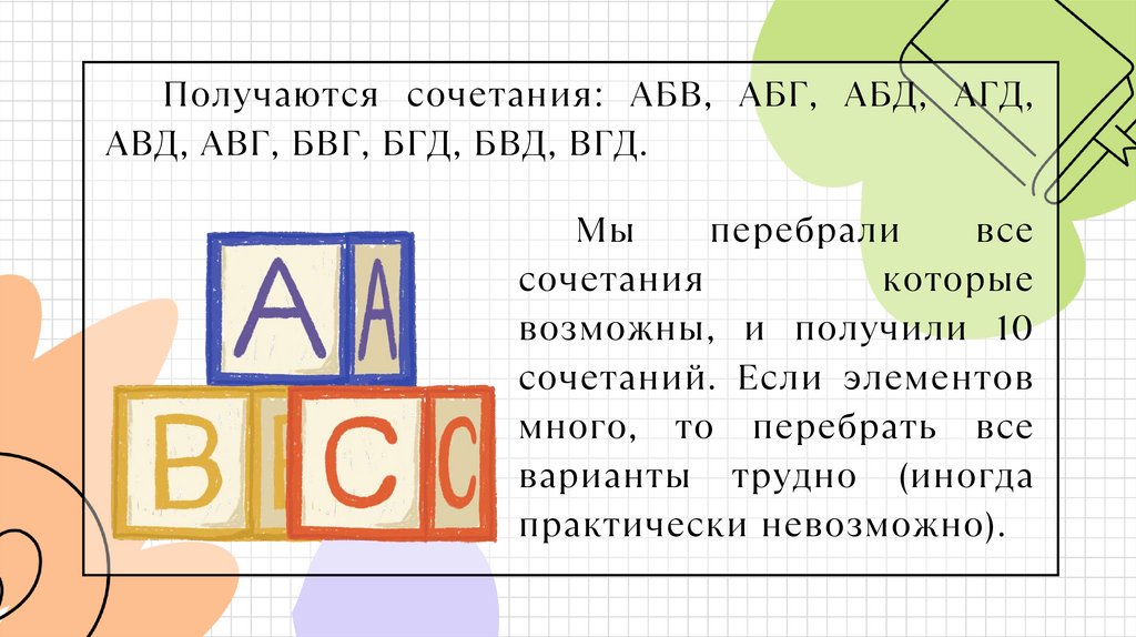 Элементов, из которых составляются сочетания,может быть большое количество. Перебирать все