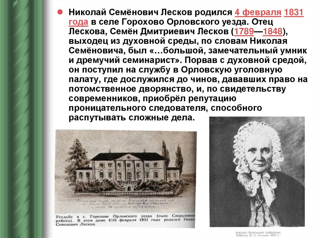 Николай Семёнович Лесков родился 4 февраля 1831года в селе Горохово Орловского уезда. Отец