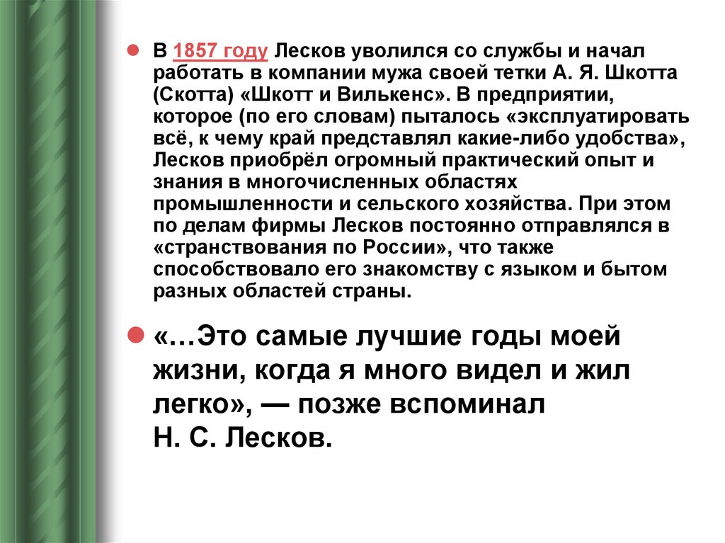 В 1857 году Лесков уволился со службы и началработать в компании мужа своей тетки А. Я. Шкотта