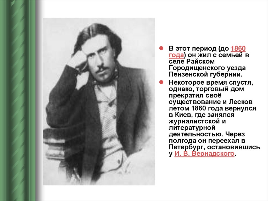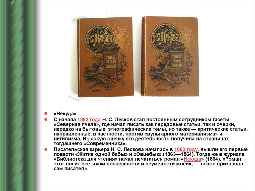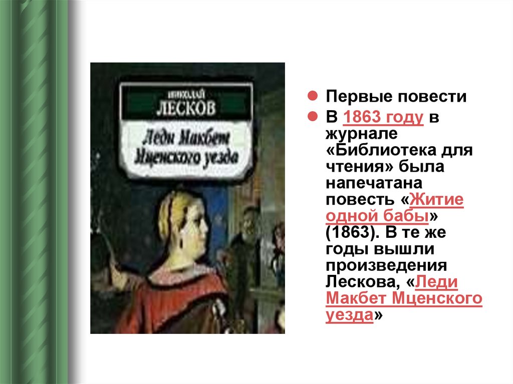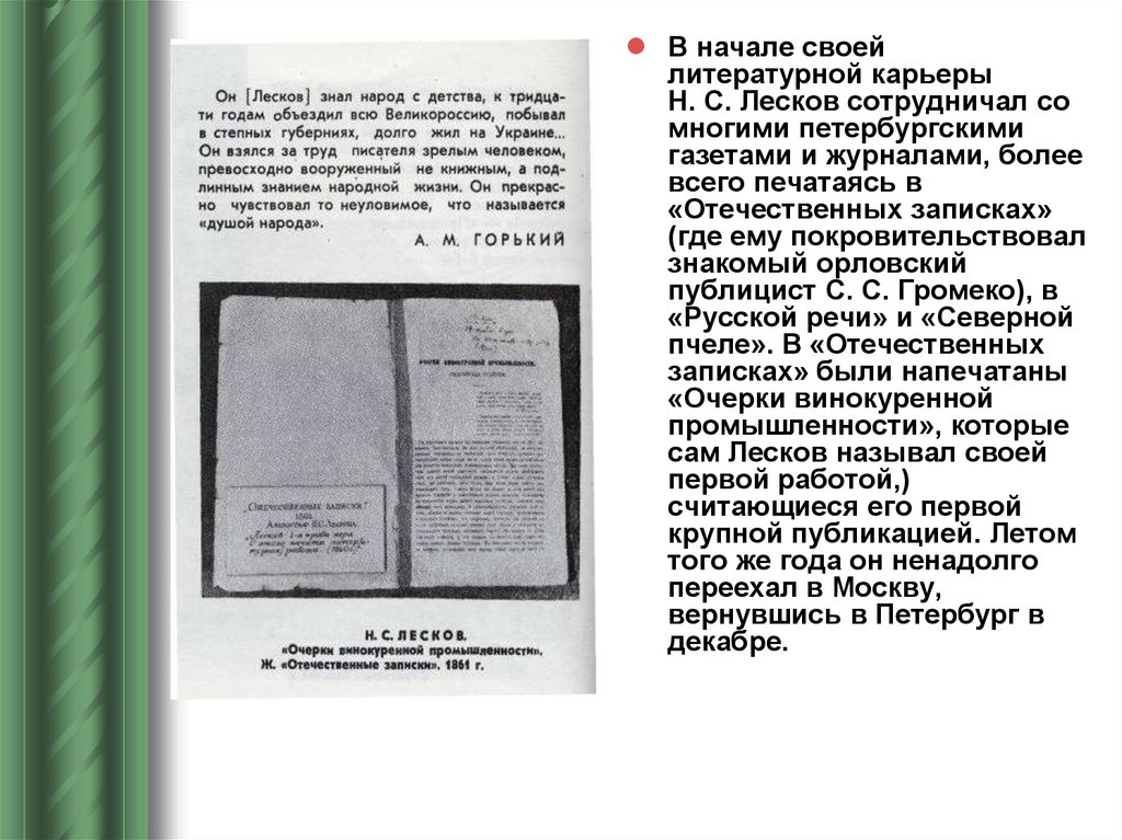 Писательская карьера Н. С. Лескова началась в 1863 году, вышли его первые