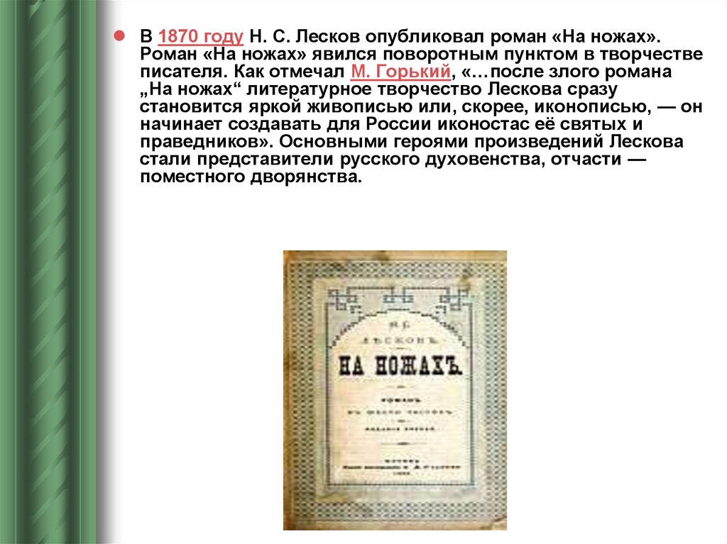 В 1870 году Н. С. Лесков опубликовал роман «На ножах».Роман «На ножах» явился поворотным пунктом в творчестве