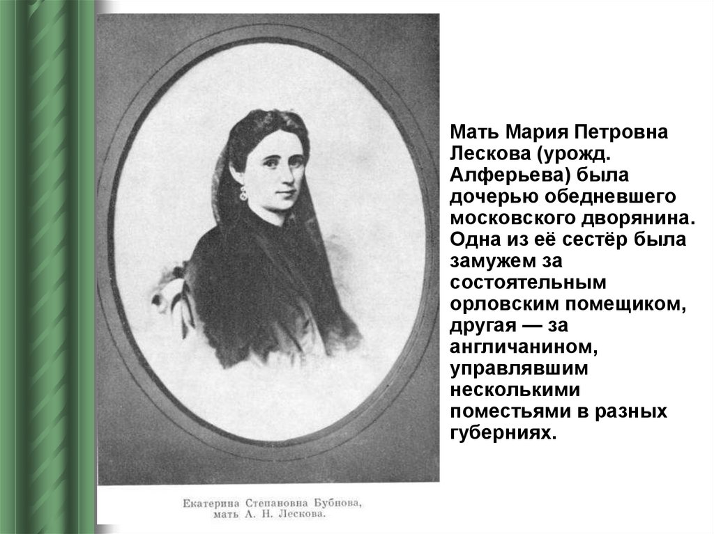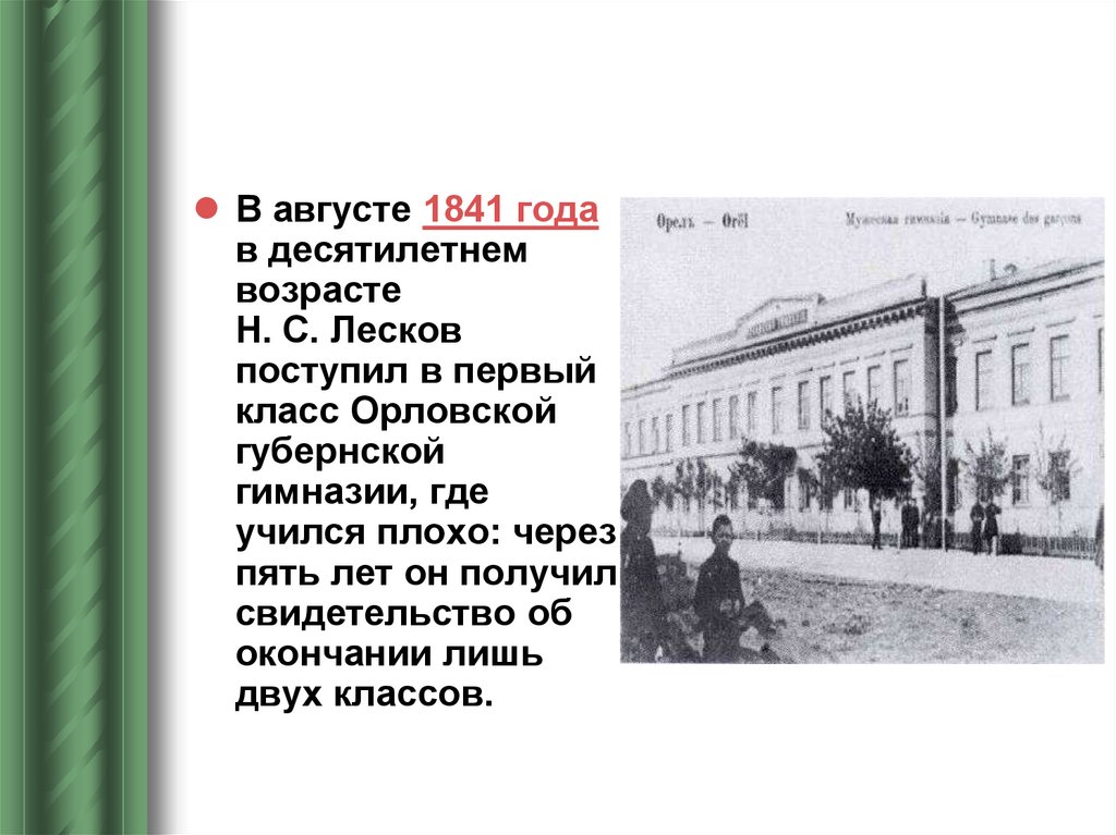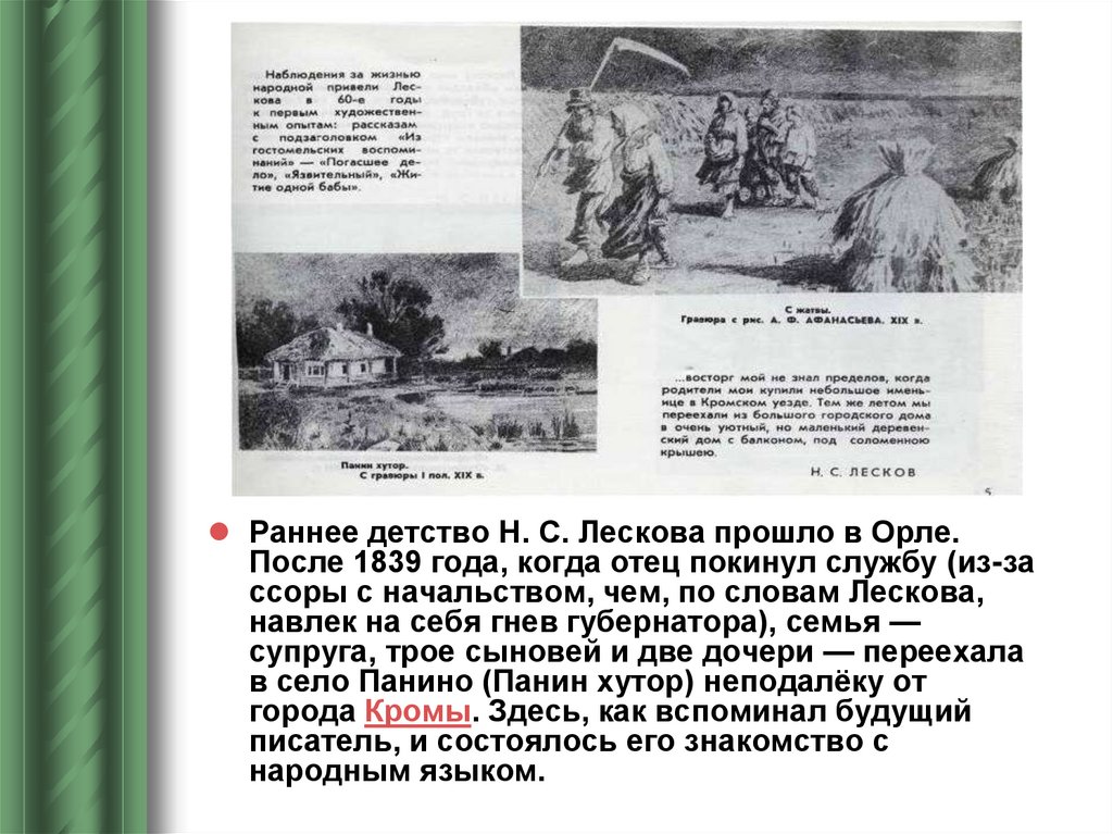 Раннее детство Н. С. Лескова прошло в Орле.После 1839 года, когда отец покинул службу (из-за