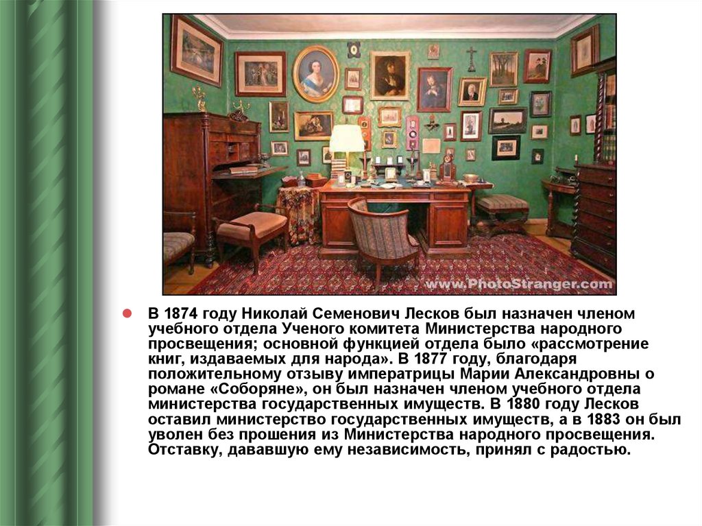 В 1874 году Николай Семенович Лесков был назначен членомучебного отдела Ученого комитета Министерства народного