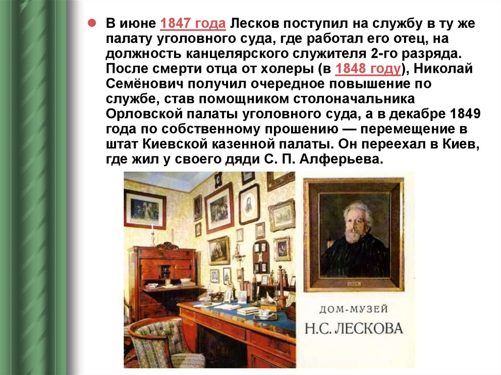 В июне 1847 года Лесков поступил на службу в ту жепалату уголовного суда, где работал его отец, на