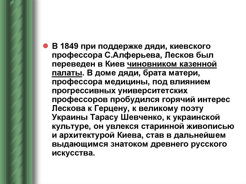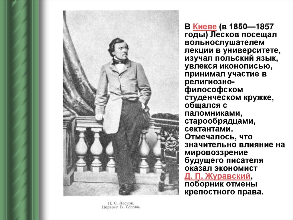 В 1849 при поддержке дяди, киевскогопрофессора С.Алферьева, Лесков был