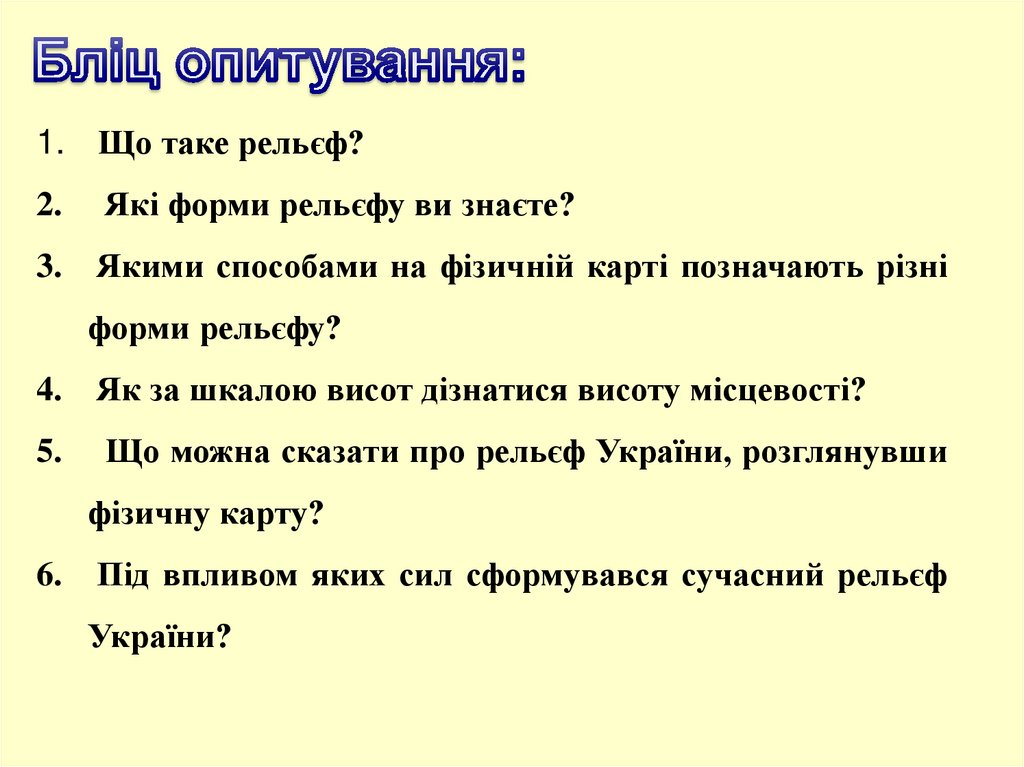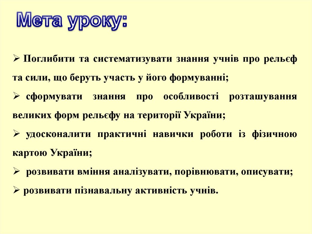 Поглибити та систематизувати знання учнів про рельєфта сили, що беруть участь у його формуванні;